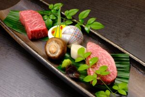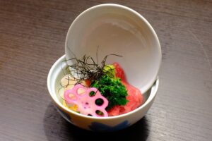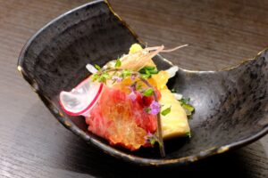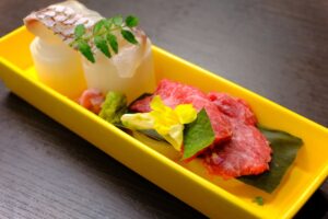 神戸牛の赤と桜鯛の白で、縁起の良い赤白仕立て、山葵と醤油でお召し上がり下さい。