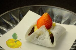 自家製のカスタードクリームとこしあんの甘さ、口溶けの良い求肥で包んだデザートです。