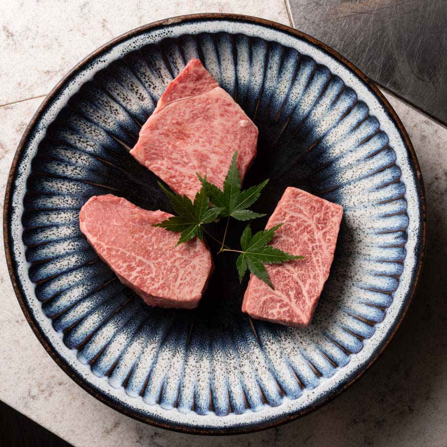 神戸牛の中から厳選した三種の部位を盛り合わせにしました。部位によって異なる甘みと香りをお楽しみください。